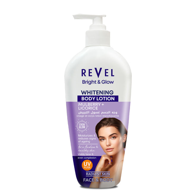 Revel bright & glow body lotion combines mulberry & Licorice extract that helps reduce the appearance of Scars, age spots, and discoloration caused by sun Exposure or other factors, soothes sensitive skin & Reduce the signs of ageing