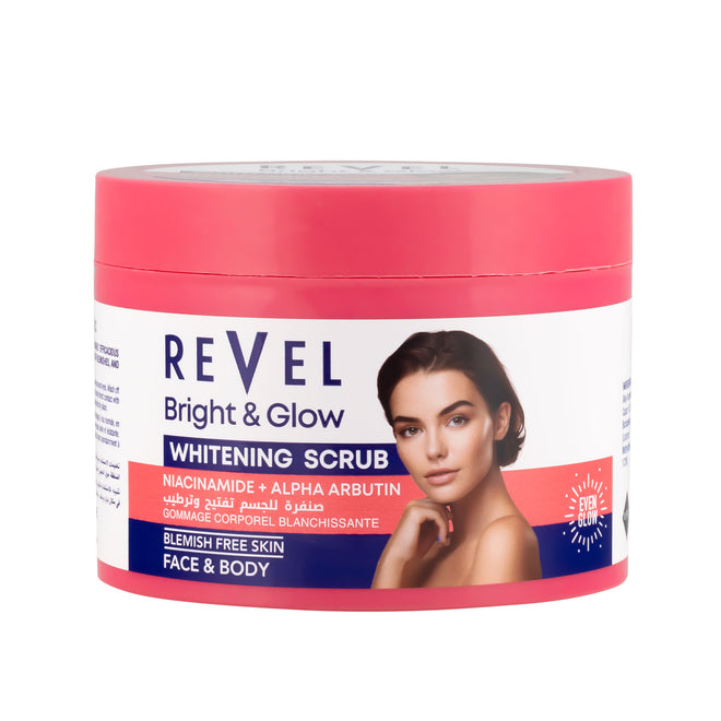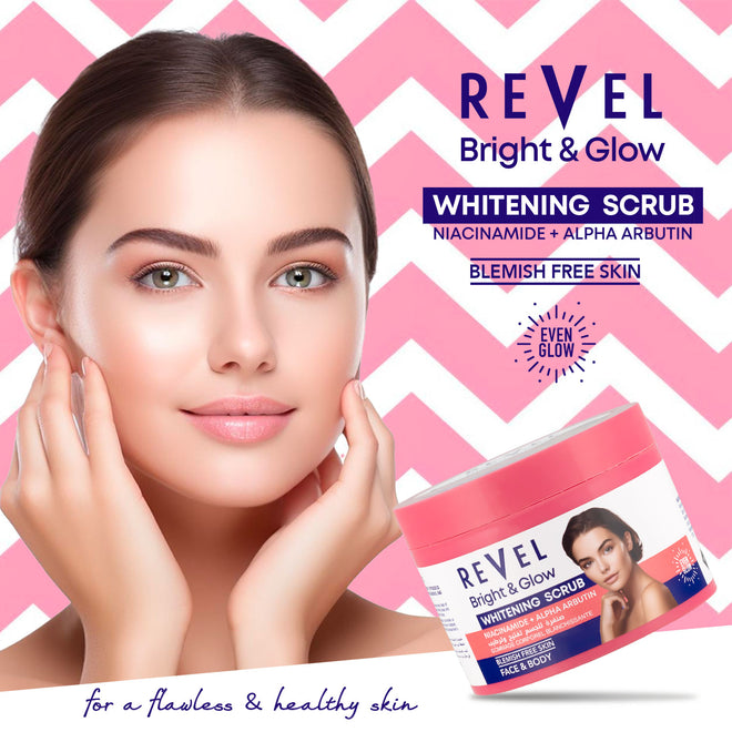 Revel bright & glow face & body whitening scrub combines highly efficacious