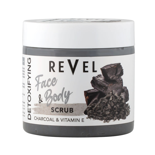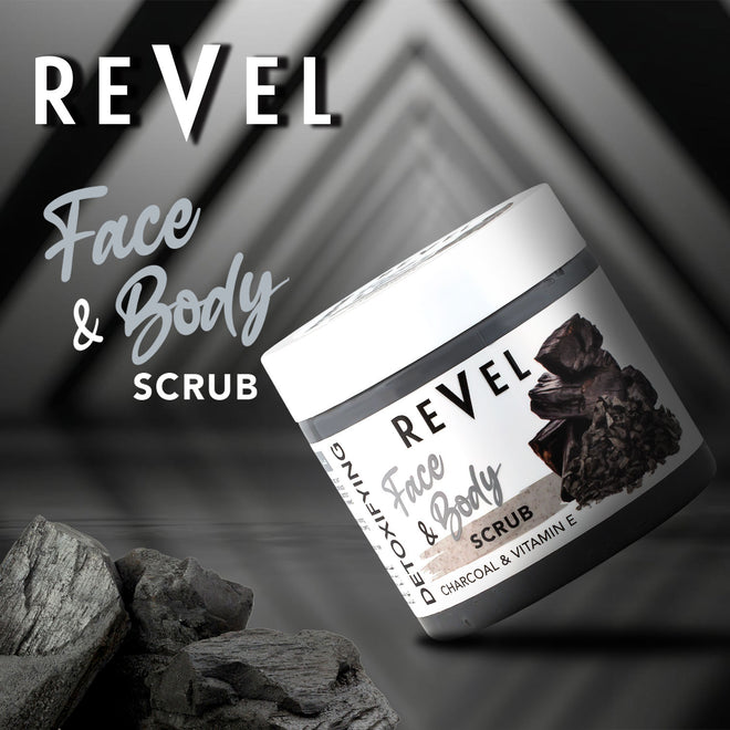 Revel Charcoal face & body scrub, with its unique formula sloughs off dead skin