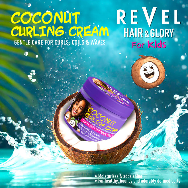 Define, soften & strengthen hair strands with Revel Coconut Curling Cream. Specially formulated with natural ingredients, our curling cream eliminates frizz, tangles and defines curls with soft hold and added shine. Helps to improve hair manageability, nourish fragile coils, curls and waves. IDEAL FOR Medium to coarse wavy or curly hair to create moisturized, flexible curls. WHY USE? its a nourishing and protective styling aid for creating a soft hold, making it easy to transform your kid's curls into beautiful, frizz-free styles