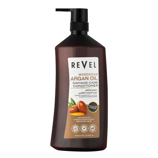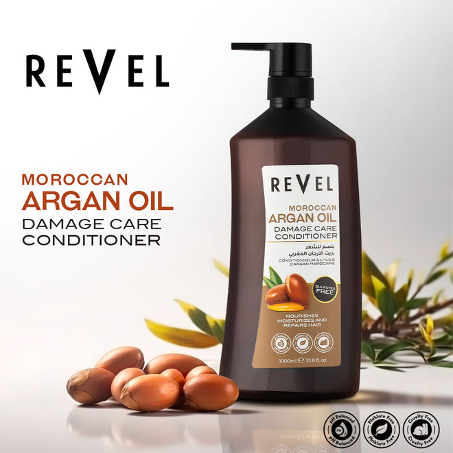 Free of sulfates, parabens, phthalates & artifical colors Revel Damage Care Conditioner that helps tame frizz, restore strength & shine to dry, brittle hair, and maintain your tresses for a soft, seductive, and silky perfection. Argan Oil: Strengthens hair from within, making your hair healthy, shiny, and easy to style. It also helps to improve hair's elasticity and restore shine to dull, lifeless hair, reducing breakage, frizz, tangles and makes your hair appear fuller.