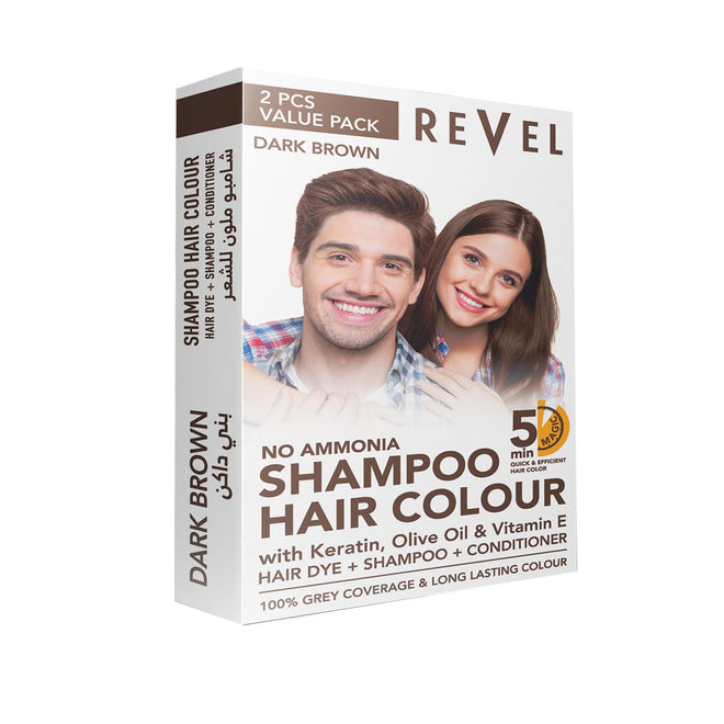 Revel’s Dark Brown Hair Colour Shampoo gives you a rich, dark brown hue with 100% grey coverage in just 5 minutes. This 2-in-1 shampoo and conditioner formula with keratin, olive oil, and vitamin E nourishes and strengthens while delivering a natural, deep color that lasts.
