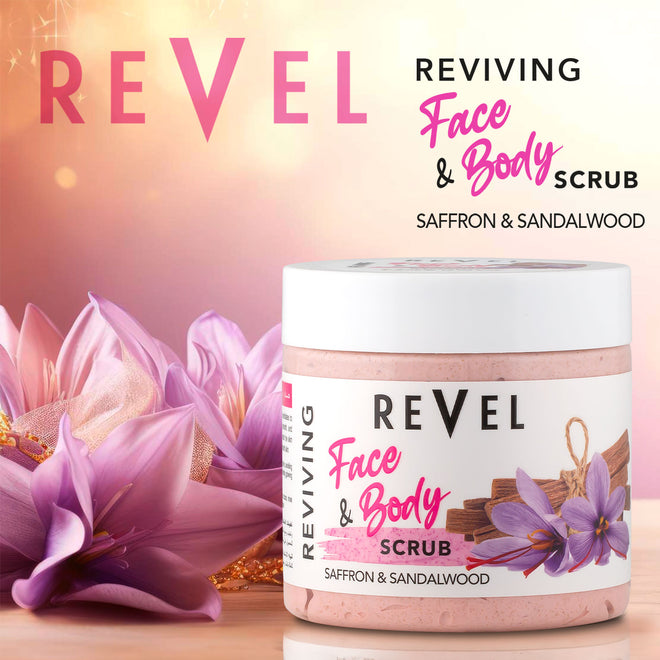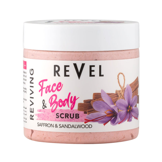 Revel Saffron & Sandalwood face & body scrub gently yet effectively exfoliates to